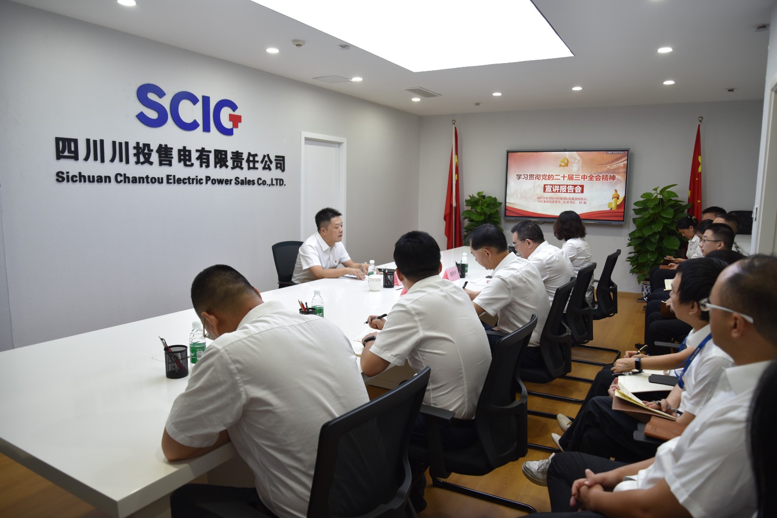 川投售電領(lǐng)導(dǎo)班子成員、全體黨員職工參加宣講會。