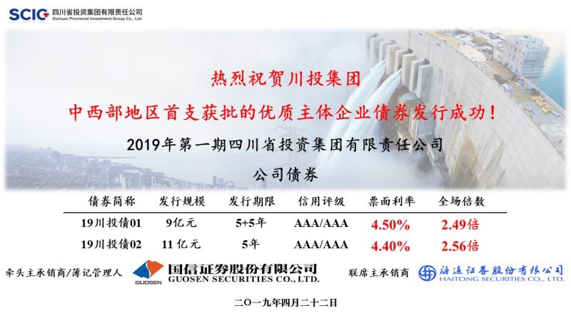 2019年4月22日,四川省投資集團(tuán)有限責(zé)任公司成功發(fā)行中西部地區(qū)首支獲批的優(yōu)質(zhì)主體企業(yè)債券。本期發(fā)行規(guī)模20億元,其中品種一“19川投債01”發(fā)行規(guī)模9億元,期限10年,票面利率4.50%;品種二“19川投債02”發(fā)行規(guī)模11億元,期限5年,票面利率4.40%。本期債券的成功發(fā)行,標(biāo)志著川投集團(tuán)依托資本市場向創(chuàng)新融資方式、促進(jìn)產(chǎn)業(yè)升級、服務(wù)四川經(jīng)濟(jì)又邁出重要一步。