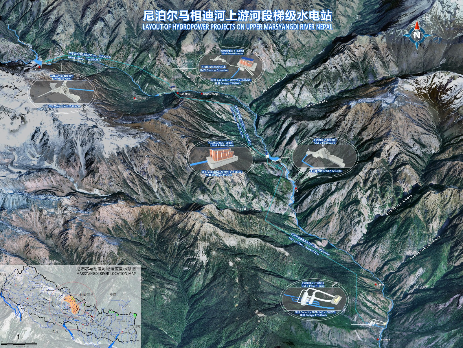 馬相迪梯級水電站項(xiàng)目位于尼泊爾甘達(dá)基省馬相迪河流域,由三座首尾相連的水電站組成,自上而下分別是馬楠馬相迪水電站、下馬楠馬相迪水電站和上馬相迪-2水電站,總裝機(jī)約60萬千瓦,總投資約12億美元。此次正式開工的馬楠馬相迪水電站作為第一級開發(fā)的水電站,總投資3.23億美元,裝機(jī)容量為13.5萬千瓦,年均發(fā)電量7.12億千瓦時(shí)。