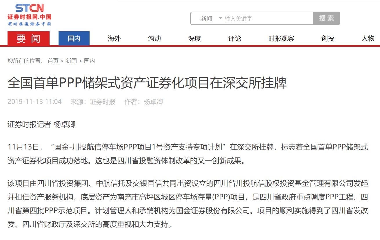 11月13日,“國(guó)金-川投航信停車場(chǎng)PPP項(xiàng)目1號(hào)資產(chǎn)支持專項(xiàng)計(jì)劃”在深交所掛牌,標(biāo)志著全國(guó)首單PPP儲(chǔ)架式資產(chǎn)證券化項(xiàng)目成功落地。這也是四川省投融資體制改革的又一創(chuàng)新成果。