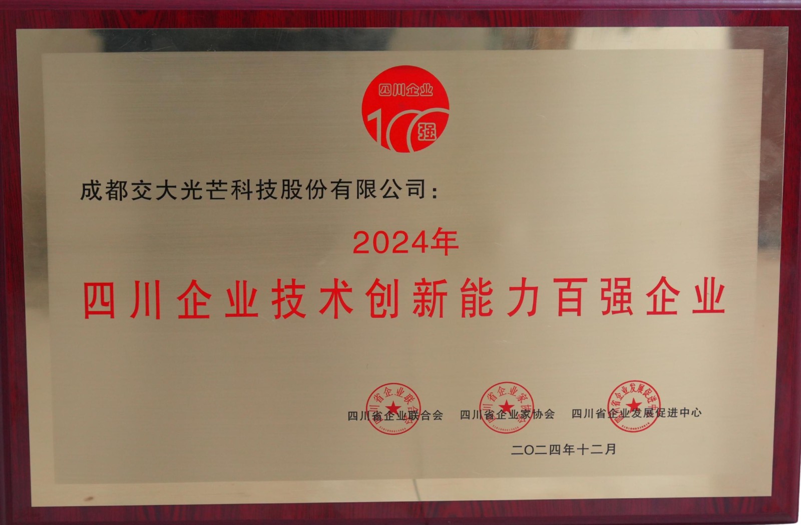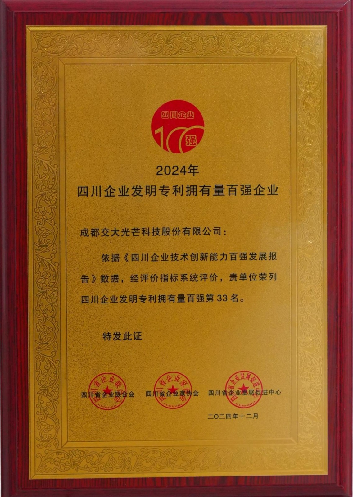 近日,以“技術(shù)創(chuàng)新榮耀四川”為主題的2024年四川企業(yè)技術(shù)創(chuàng)新發(fā)展大會在成都召開,本次大會由四川省企業(yè)聯(lián)合會、四川省企業(yè)家協(xié)會和成都市金牛區(qū)人民政府聯(lián)合主辦。大會發(fā)布《2024四川企業(yè)技術(shù)創(chuàng)新發(fā)展能力百強(qiáng)發(fā)展報告》,并公布49名企業(yè)技術(shù)創(chuàng)新突出貢獻(xiàn)人物。川投能源所屬交大光芒榮獲四川企業(yè)技術(shù)創(chuàng)新能力百強(qiáng)企業(yè)(第42位)和四川企業(yè)發(fā)明專利擁有量百強(qiáng)企業(yè)(第33位),公司首席專家、副總經(jīng)理陳奇志榮獲“2024年四川企業(yè)技術(shù)創(chuàng)新突出貢獻(xiàn)人物”稱號。交大光芒已連續(xù)三年獲評“雙百強(qiáng)”企業(yè)。