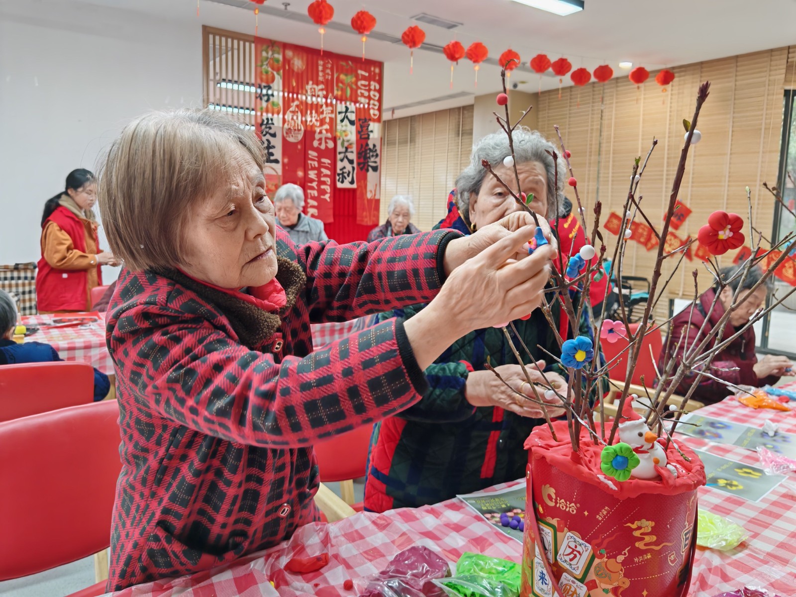 頤康養(yǎng)老中心組織長者寫春聯(lián)、貼福字,為養(yǎng)老院送上蛇年的第一份美好祝福。家庭團餐、年味特色菜品、拜年送福活動,讓長者體驗到家的濃濃年味。